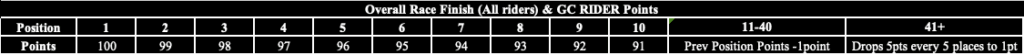 - GC Rider – 1 rider per team who will earn finishing points against all other GC riders only, plus finishing points when considering all riders in the race together