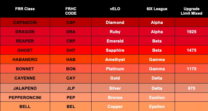 6IX runs from October to the World Finals in March, vELO scores will rise and fall in this period. The upgrade limits shown below allow upgraded riders to remain racing in a League as long as their vELO rating does not exceed the upgrade limit shown. Once a rider becomes too powerful for a League they will nolonger be selectable.